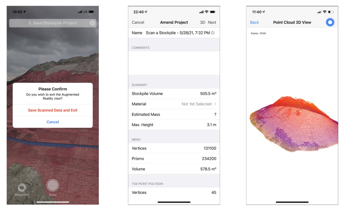 Mit StockAce können Halden, Gruben oder Gräben aufgenommen werden. Der im iOS-Smartphone oder Tablet integrierte LiDAR Scanner ermöglicht das Scannen von Kubaturen (Bild rechts). Aus den aufgenommenen Punktwolken lassen sich Volumen ermitteln. Alternativ kann die Volumenermittlung über die Aufnahme von Querprofilen erfolgen.