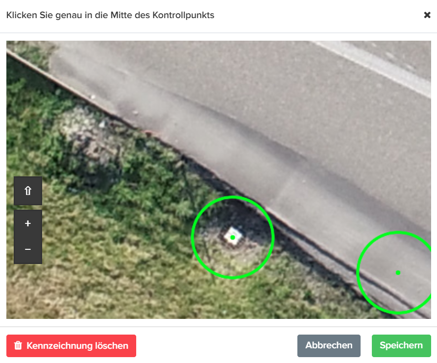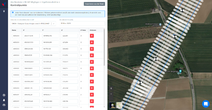 Die Koordinaten der Passpunkte werden direkt in die Plattform eingeladen. Das Datenformat sollte Punkt als Dezimaltrennzeichen und Komma-CSV-Trennung beinhalten. Nach dem Hochladen der Koordinaten, unter Abgabe des EPSG-Codes des verwendeten Koordinatensystems. Auf der Plattform werden die Passpunkte, zusammen mit den tausenden Luftbildern angezeigt. Im weiteren Schritt müssen die Passpunkte auf den Rohbildern markiert werden.