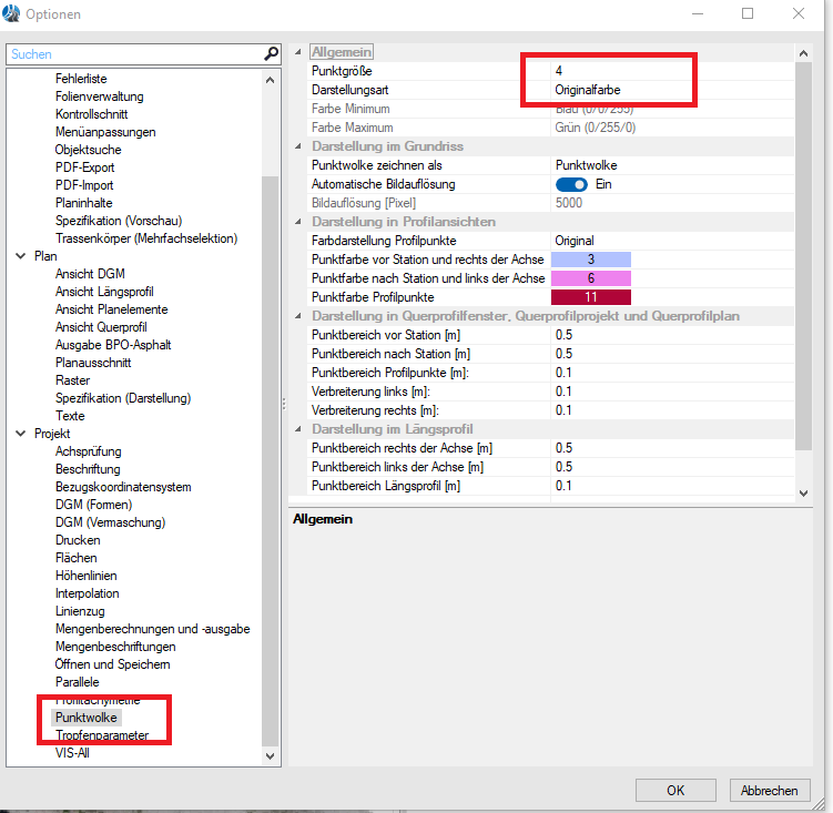 Unter Optionen (Punktwolke) kann man die verschiedenen Darstellungen wie z.B. die Punktgröße oder Darstellungsart