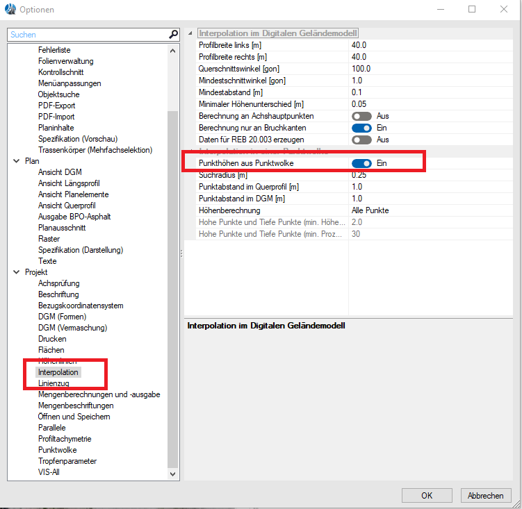 Unter Optionen (Interpolation) Punkthöhen aus Punktwolken auf ein Stellen da sonst die Punktwolke nicht berücksichtigt wird.